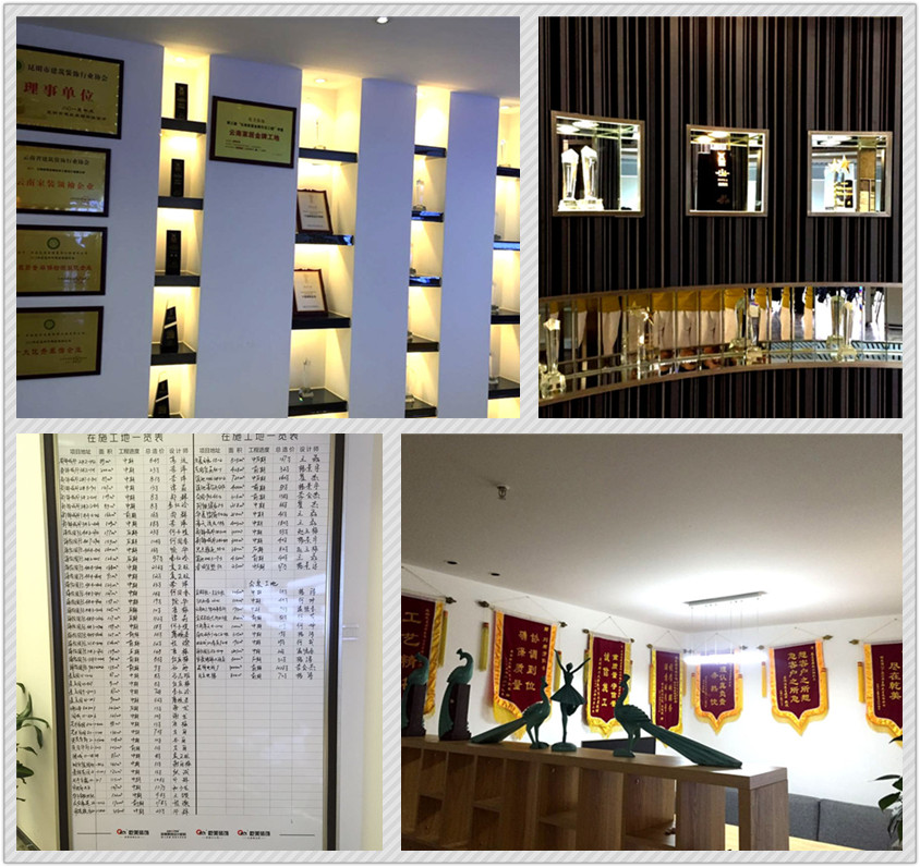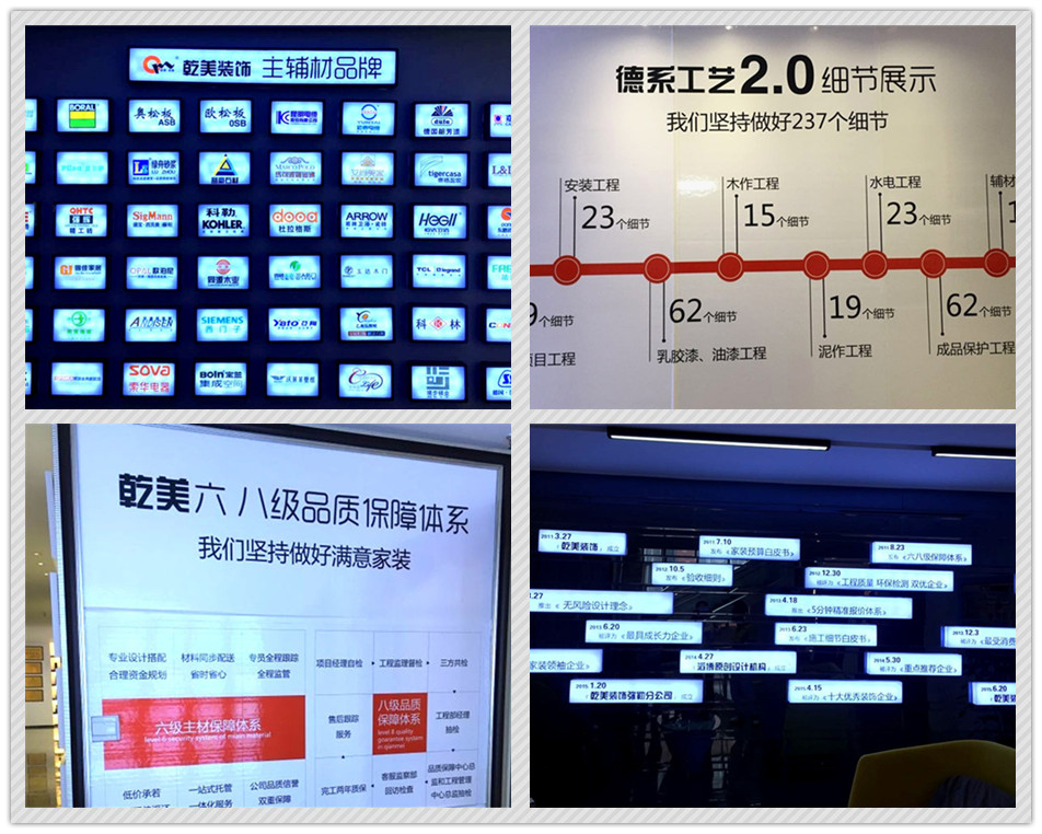 乾美是一个成立不到6年的“新企业”,却成为了云南装饰行业的龙头企业之一,可谓行业标杆。在拜访过程中,何喆带领高管中心的教务参观了家居体验馆和产品展厅,直观、全面地展示了乾美装饰的风格样貌。乾美在展厅墙上展示了企业大事记、主辅材品牌、所获荣誉等。
