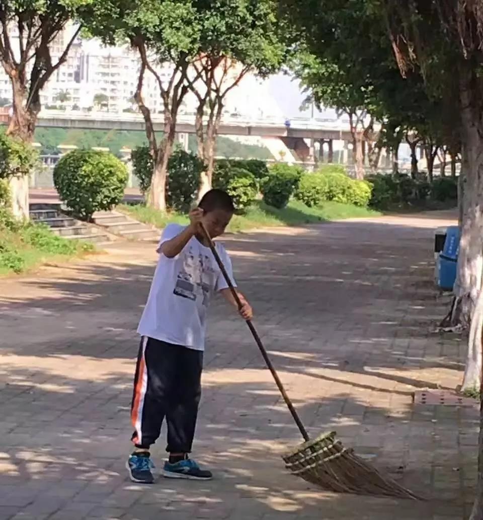 每个周末的清晨,我都会去小区后面的一颗大榕树下晨读。经常能看到这个小男孩,帮他做环卫工的母亲打扫街道。
