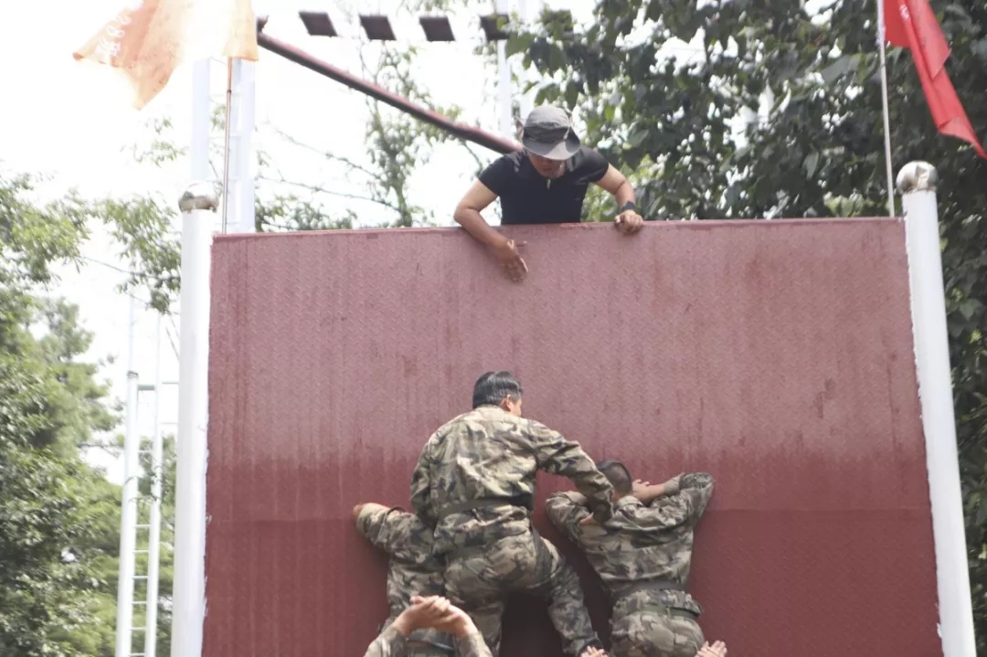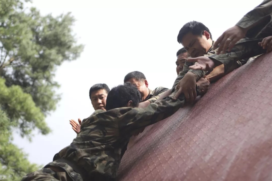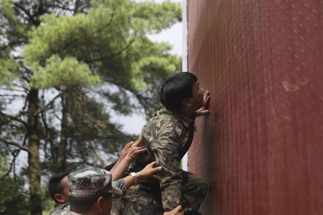 训练的最后一个科目是翻越毕业墙。面对4.5米的光滑墙面,不能借助任何外力,在不允许说话的情况下,要全员翻过去。