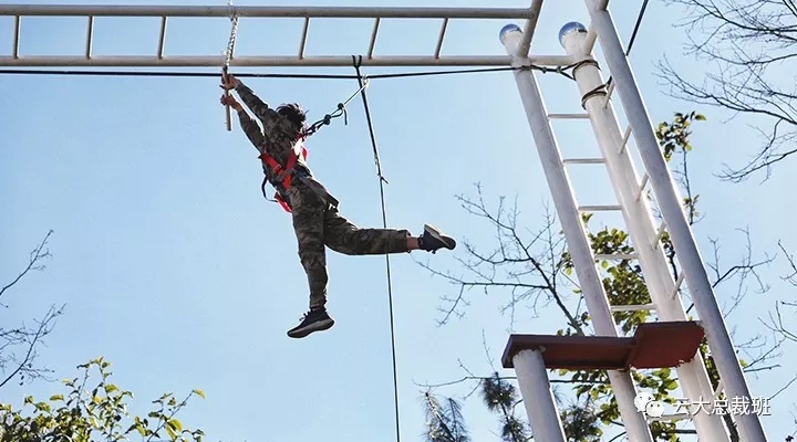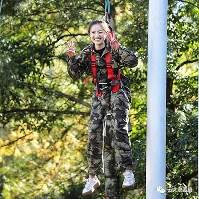 在挑战勇气的“溜索”项目中,学员们大胆挑战连女同学也不例外