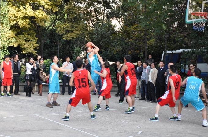 校园的一角时时传来一阵阵的欢呼声、呐喊声,声音时高时低,吸引了路过的行人,原来是云南大学总裁班在进行篮球联谊赛,只见球场四周围满了人,大家眼睛盯着同一个方向,不时的鼓掌、不时的呐喊,有人拿着手机在录像,也有人拿着相机在拍照,球场的一边挂了一条横幅,上面写着:“云南大学总裁班第2届篮球联谊赛”,球场上红色和蓝色的队员在激烈的争夺着,球场边两支比较醒目的队员手里拿着彩色的丝巾挥舞着,一边高喊:“一班,加油!”,另一边在喊:“二班,我爱你!”,喊过之后,整个球场欢呼,笑的笑,鼓掌的鼓掌。队员们有五十岁的,也有三十来岁的,随着一阵口哨声,队员们从左边跑到右边,又从右边跑到左边,看得出大家都汗流夹背,却努力的争抢着,同时脸上流露出幸福的笑容。