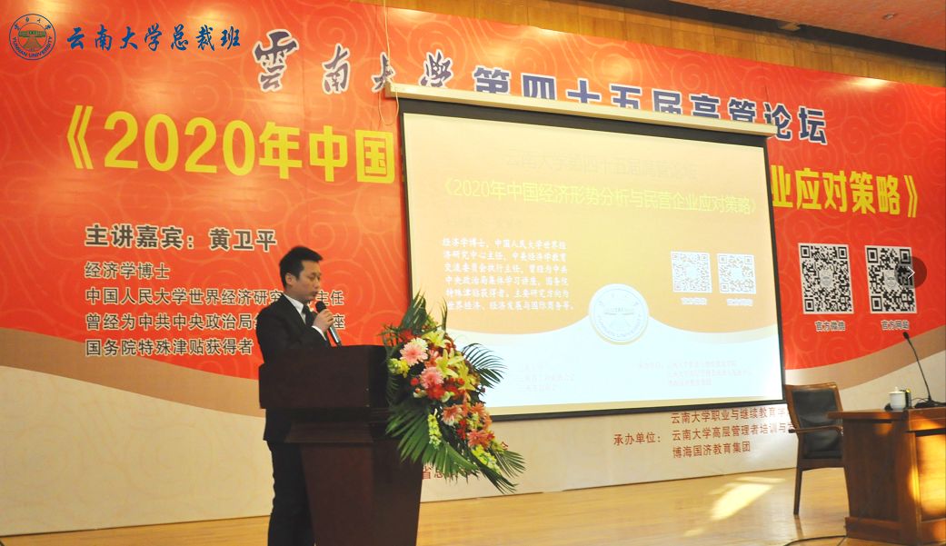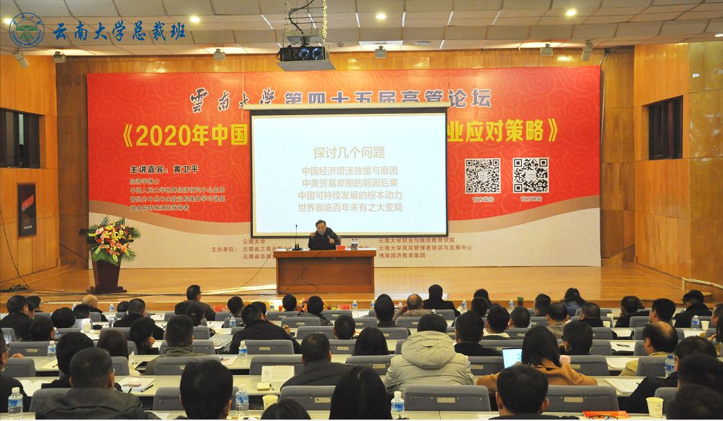 12月7日上午9:00,500余名企业家聚集云南大学科学馆一楼报告厅,他们都是云南各行各业的企业家,虽然来自不同的行业,但他们都有共同的渴望和目的,聆听黄卫平教授“2020年中国经济形势分析与民营企业应对策略”。中国人民大学世界经济研究中心主任黄卫平教授、云南大学高层管理者培训与发展中心总顾问赵海博老师、云南省工商业联合会会员处副处长高鹏先生、云南大学高层管理者培训与发展中心主任王玮老师、云南大学高层管理者培训与发展中心副主任张萍萍老师出席了本次论坛。